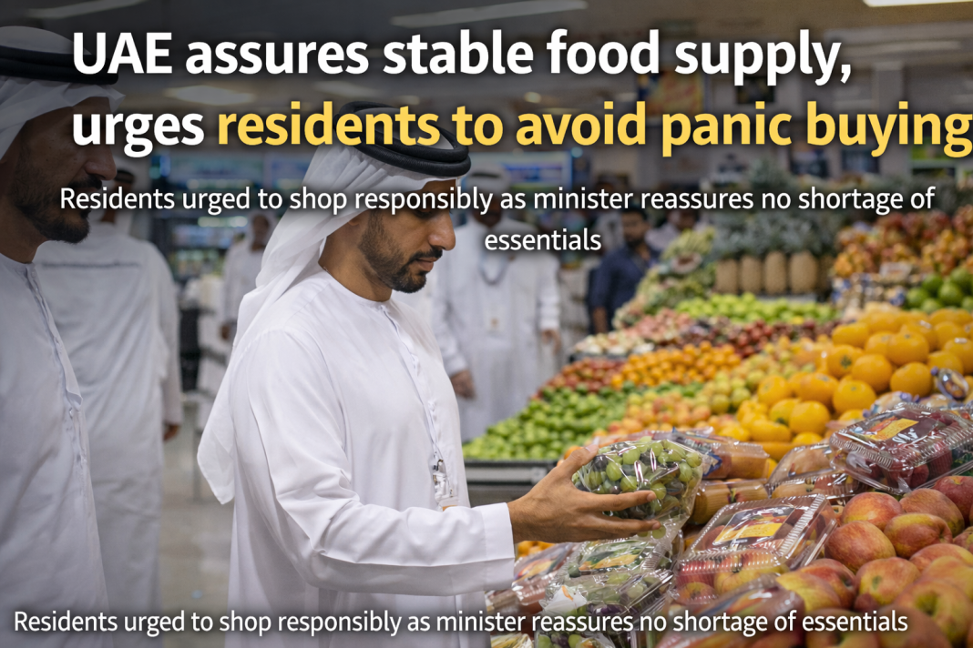 The minister said that buying much food is bad because it can go to waste and cause problems for the people who bring food to the UAE. The government wants people to buy food like they normally do so that everyone can get the food they need.